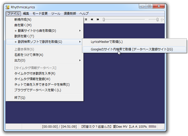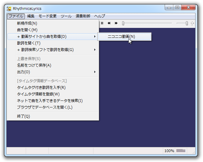 (1) RhythmicaLyricsを起動。 メニューから[ファイル>+動画サイトから曲を取得>ニコニコ動画]