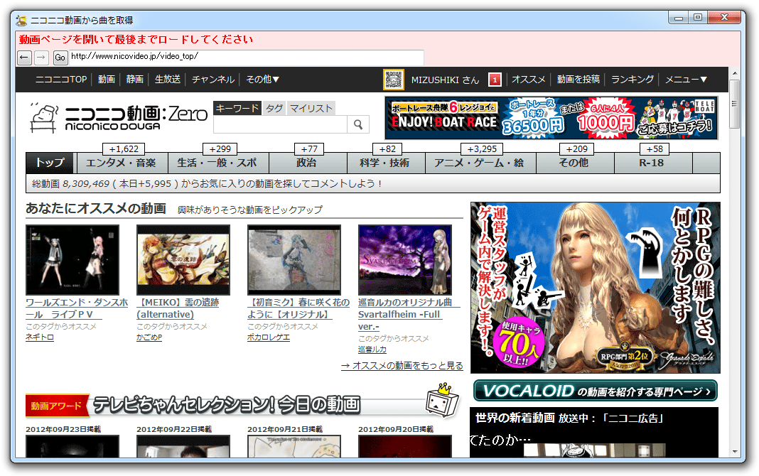 (2) 開いた内部ブラウザ上で取得したい動画のページを開く。 動画を最後までロードする。