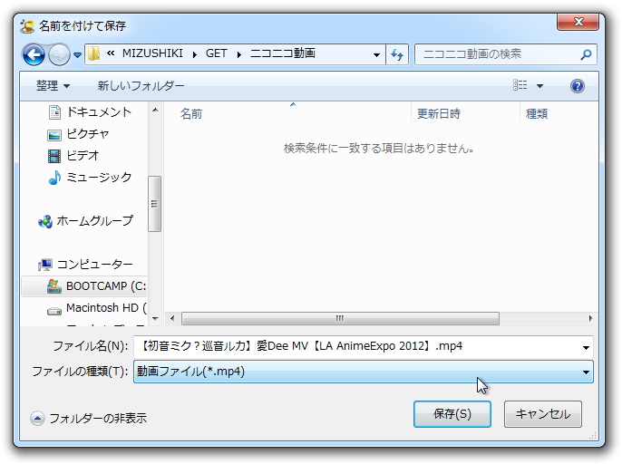 (5) ついでなのでニコカラ用の動画も保存する。 もう一度、ニコニコの動画ページを開いて保存ダイアログを出す。[ ファイルの種類]で動画ファイル形式を選択する。