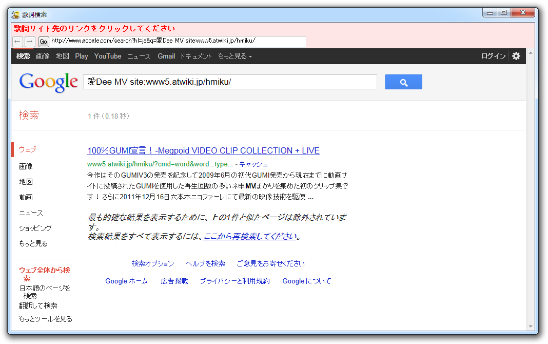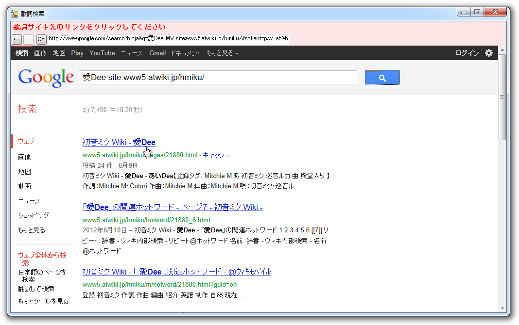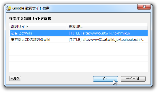 (3) 「Google歌詞サイト検索」ウィンドウで初音ミクWikiを選択。