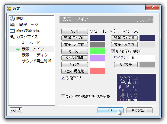 ・[ツール>設定>カスタマイズ>表示 - メイン>「多段ワイプ」と「ルビ表示」にチェック]