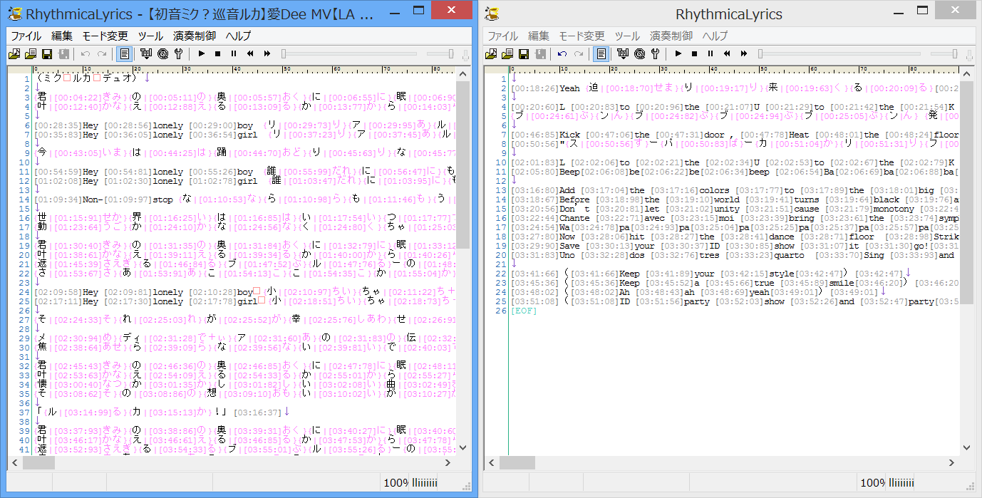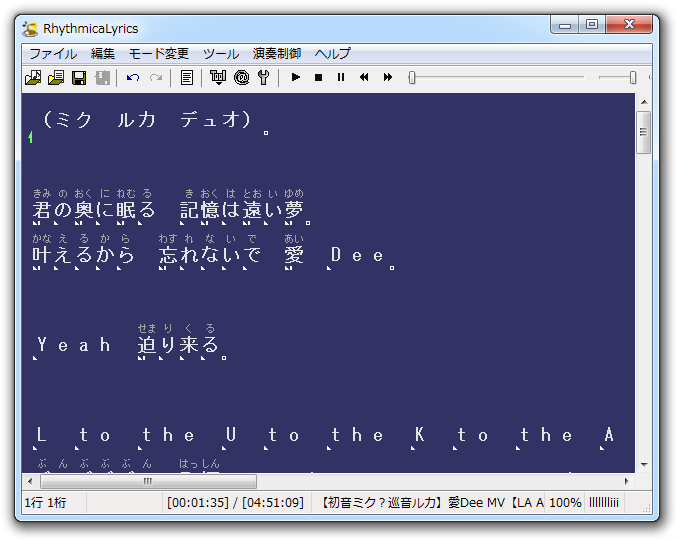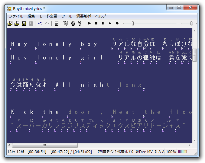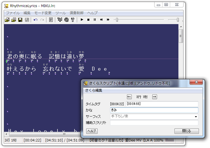 2. RhythmicaLyricsでタイムタグを付けて、ルビ付きkraファイルの作成