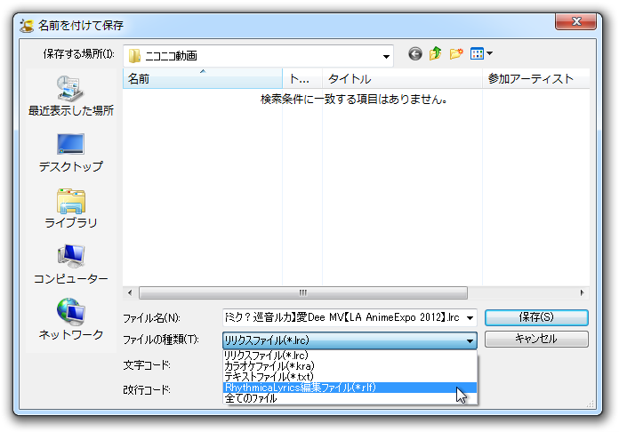 (4) 全部付け終わったら、一度編集状態を保存する。 [ファイル>名前をつけて保存>ファイルの種類] RhythmicaLyrics編集ファイル(*.rlf)で保存。(歌詞、タイムタグ、チェック、ルビとか全部保存される)