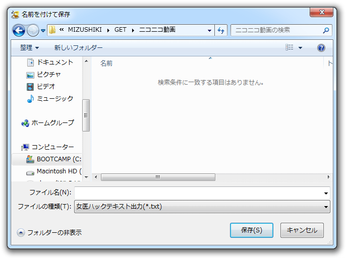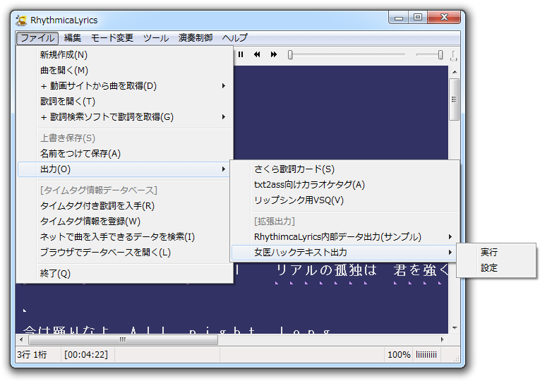 (2) [ファイル>出力>女医ハックテキスト]の[実行] で女医ハックテキストを保存する。