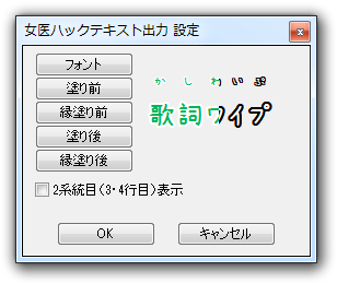 (1) [ファイル>出力>女医ハックテキスト]の[設定]でフォントの種類と色を変更できる(サイズは後でaviutl側で設定する)。