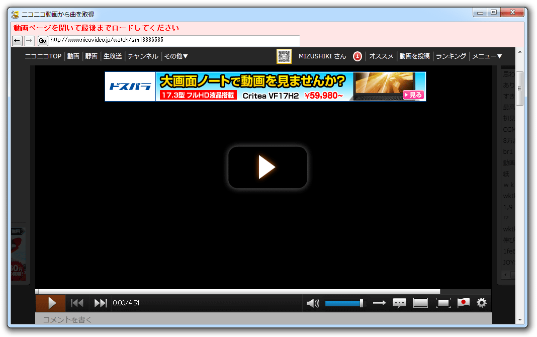 (2) 開いた内部ブラウザ上で取得したい動画のページを開く。 動画を最後までロードする。