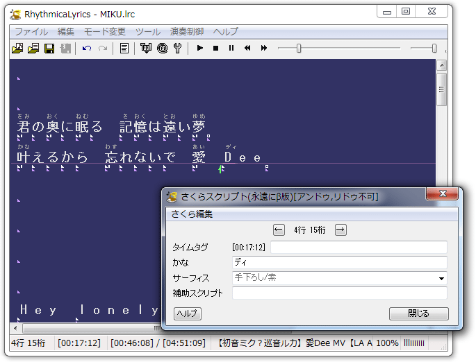 2. RhythmicaLyricsでタイムタグを付けて、ルビ付きkraファイルの作成